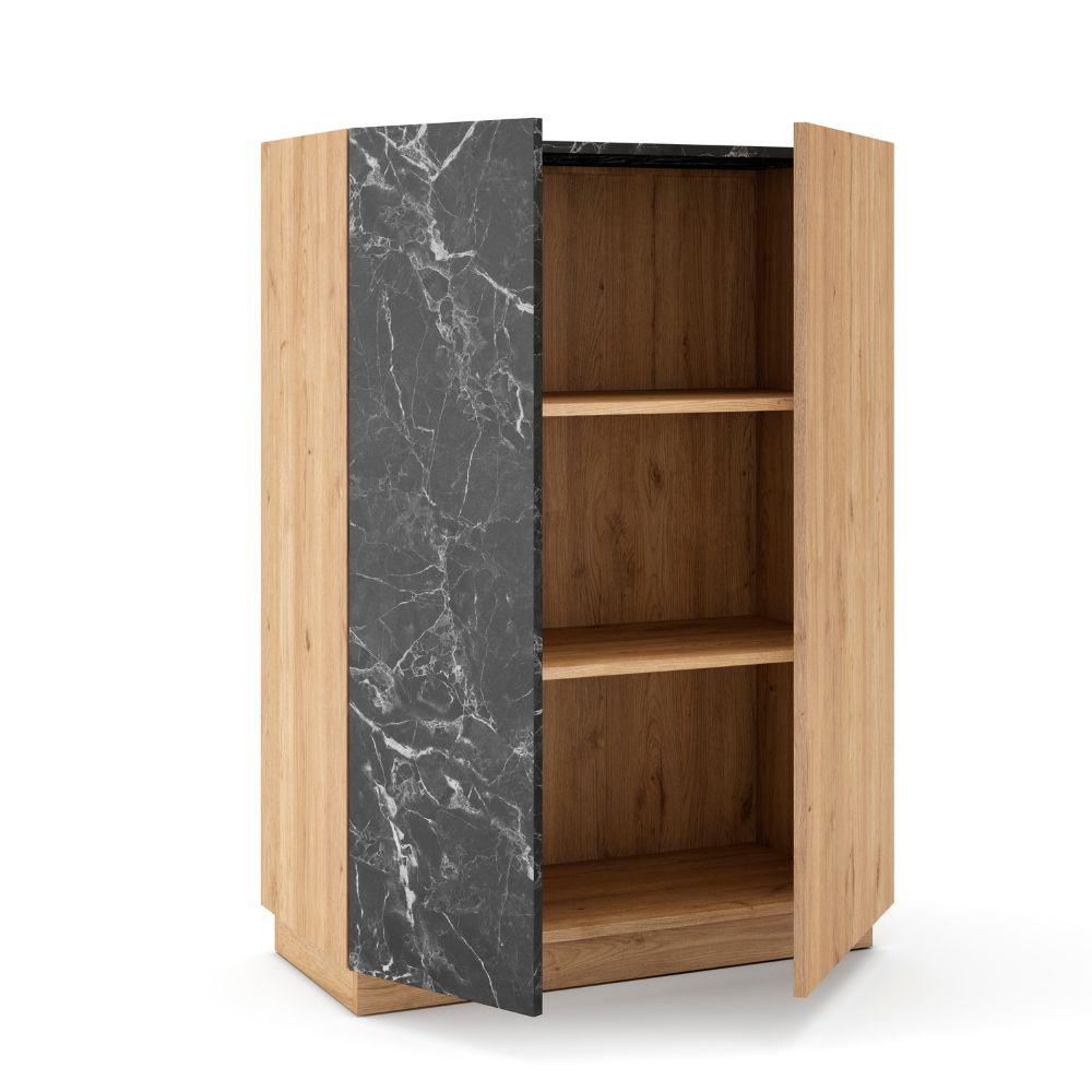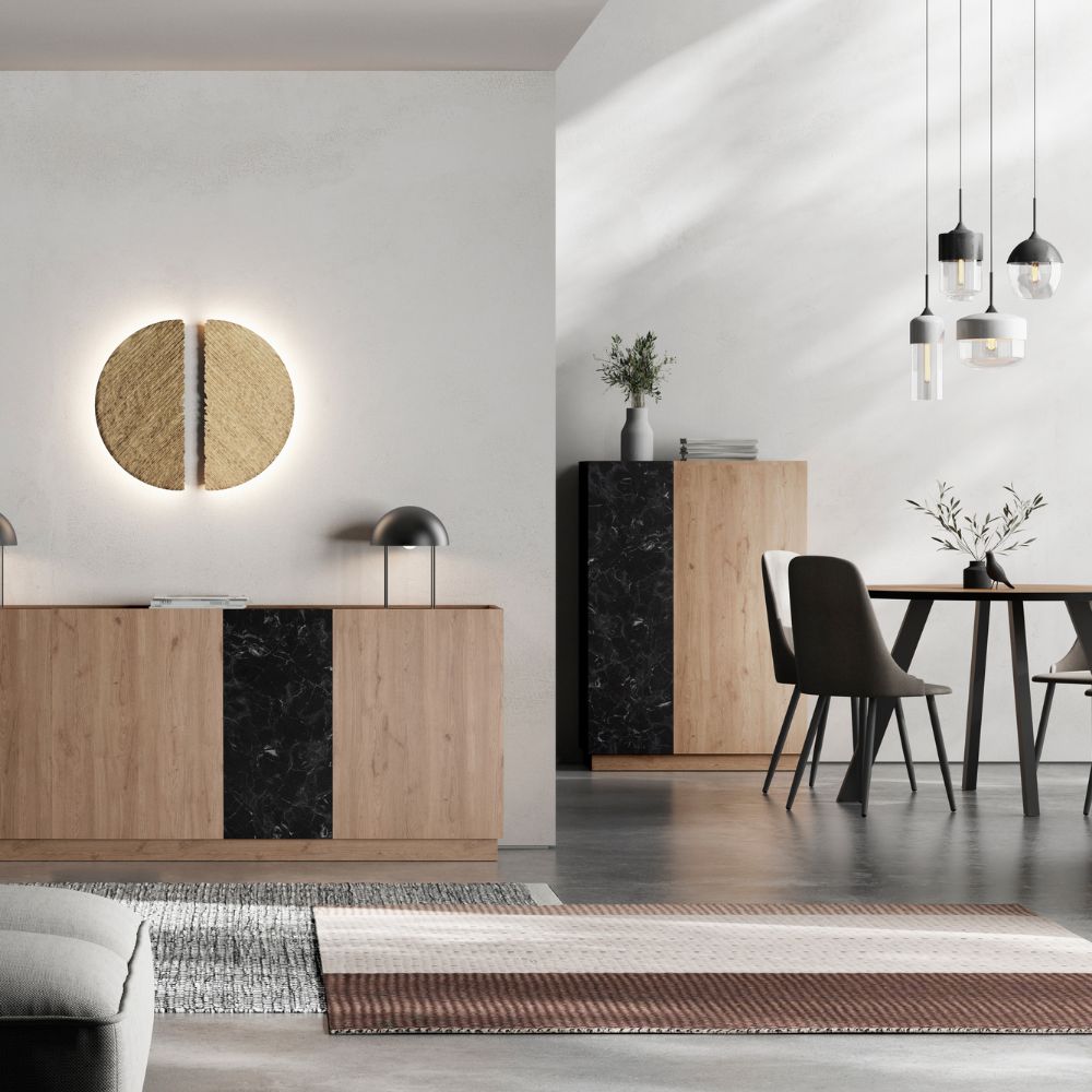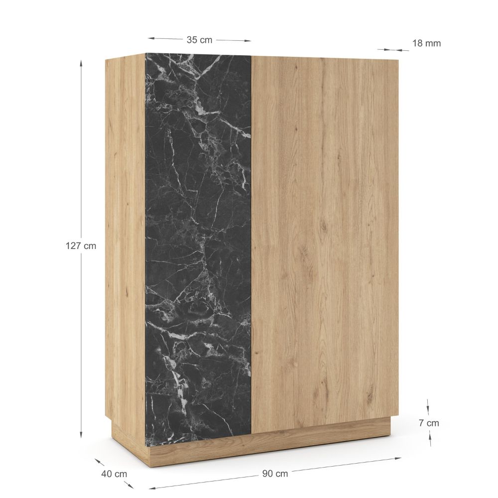 Un aparador alto color roble y mármol con 2 puertas de diseño que nos ofrece diferentes posibilidades y espacios.