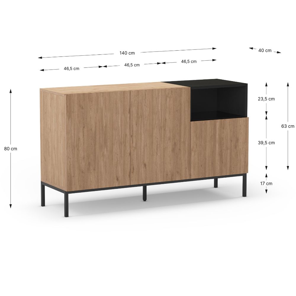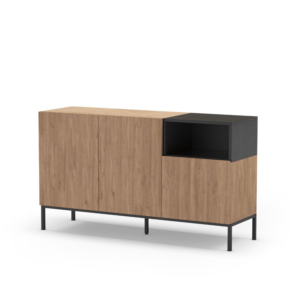 Un aparador color roble y negro de 3 puertas y 1 hueco de diseño que nos ofrece diferentes posibilidades y espacios.