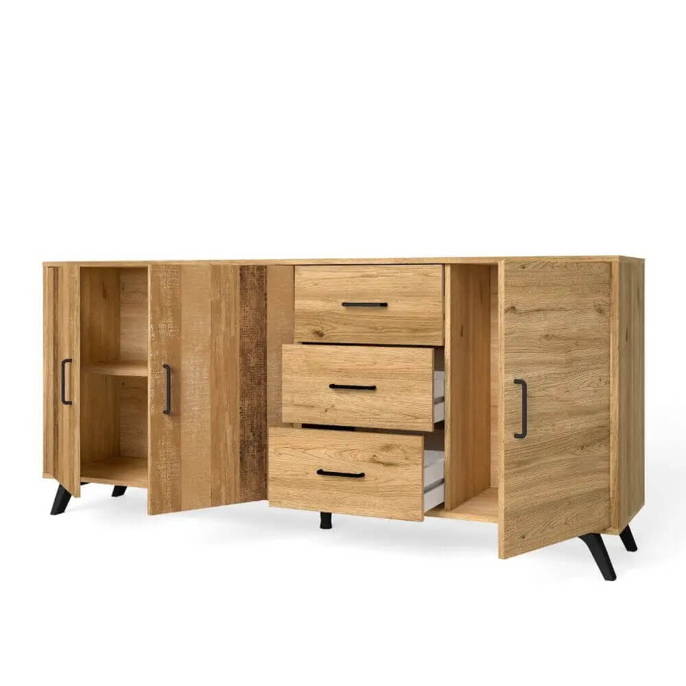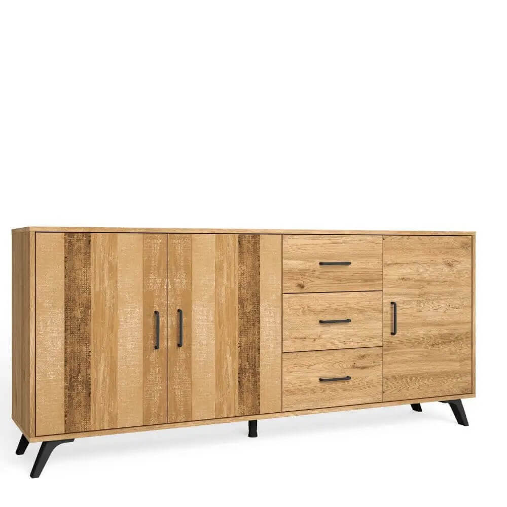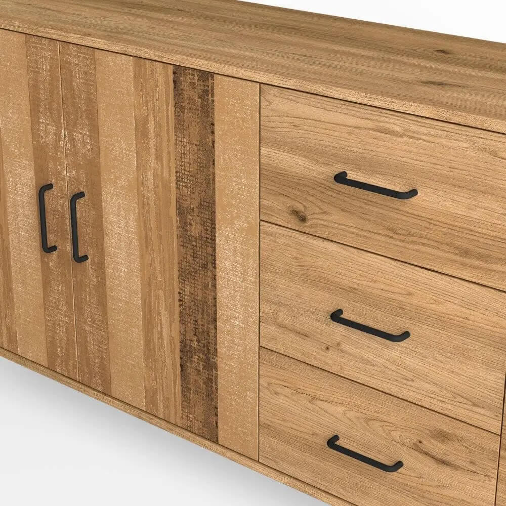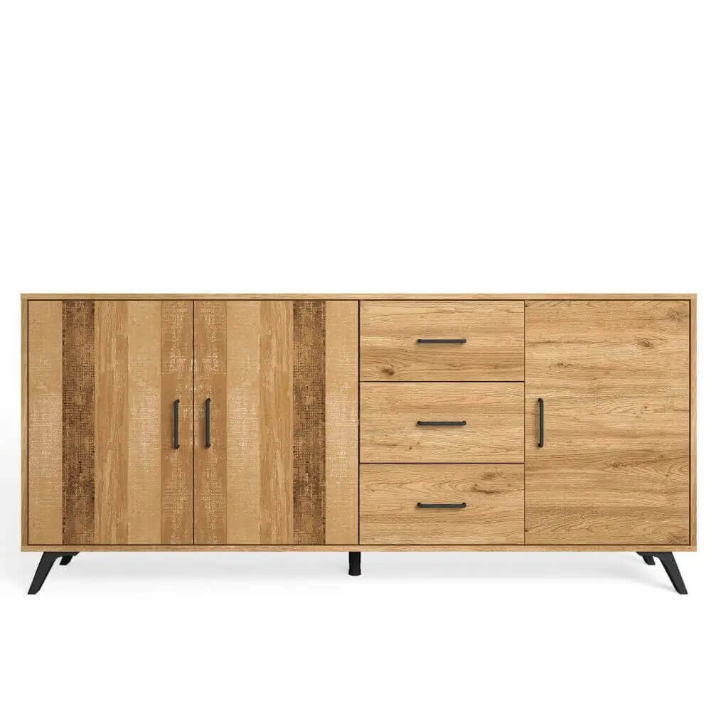 Aparador de 3 puertas 180,5 cm también dispone de 3 cajones en la parte central derecha, fabricado en melamina natural, disponible en color Roble y con serigrafia.