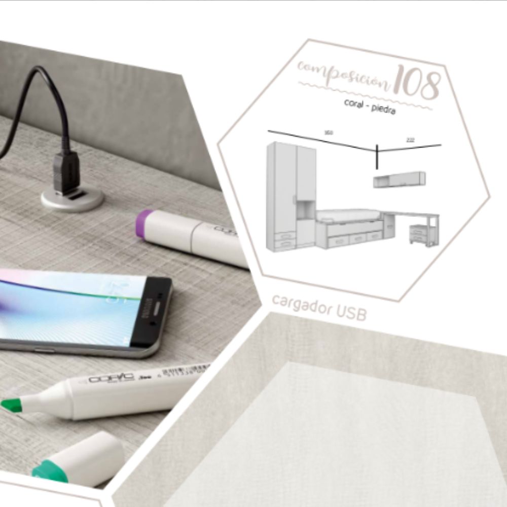 La composición de dormitorio juvenil completa 108 los materiales más adecuados para la elaboración del mueble: PANEL MELAMÍNICO, fabricado con los requisitos de calidad que hoy en día predominan cumpliendo las normas europeas.