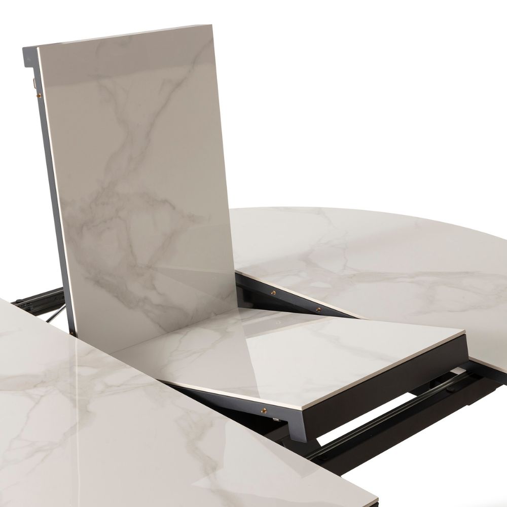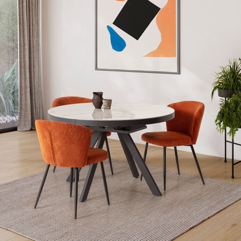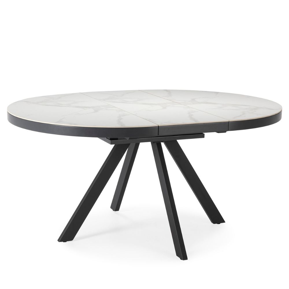 Si buscas una mesa redonda extensible y su tapa sea de cerámica blanca para tu salón.