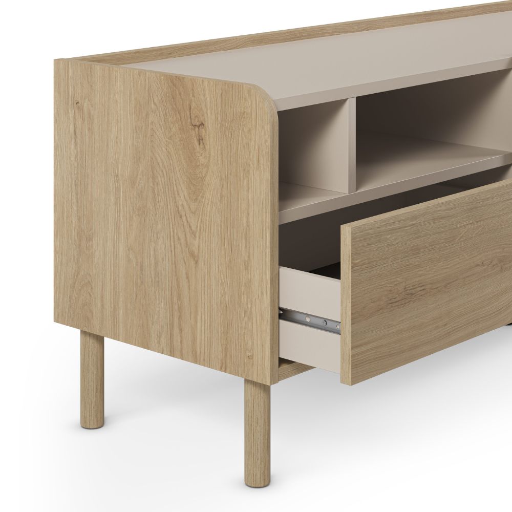 Fabricado en melamina de alta calidad, este mueble destaca por su resistencia y durabilidad. Cuenta con tres puertas, un cajón y un hueco abierto, ofreciendo una excelente capacidad de almacenaje para dispositivos electrónicos, libros o elementos decorativos.