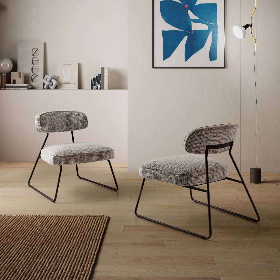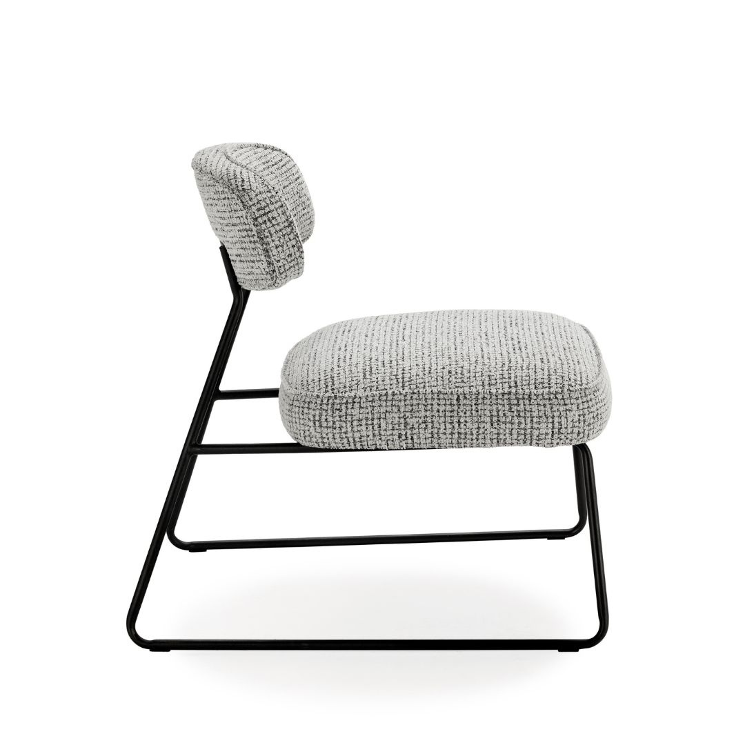 El contraste entre el tapizado en tono claro y la estructura metálica negra aporta personalidad y elegancia, haciendo que esta silla sea tanto funcional como decorativa. Su asiento amplio y acolchado ofrece un confort excelente, ideal para largas conversaciones, lectura o momentos de relax.