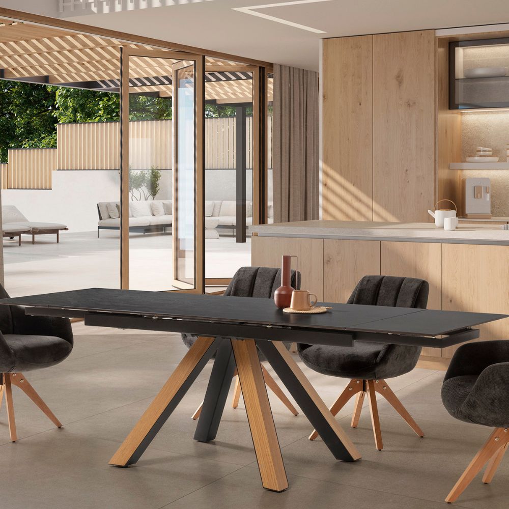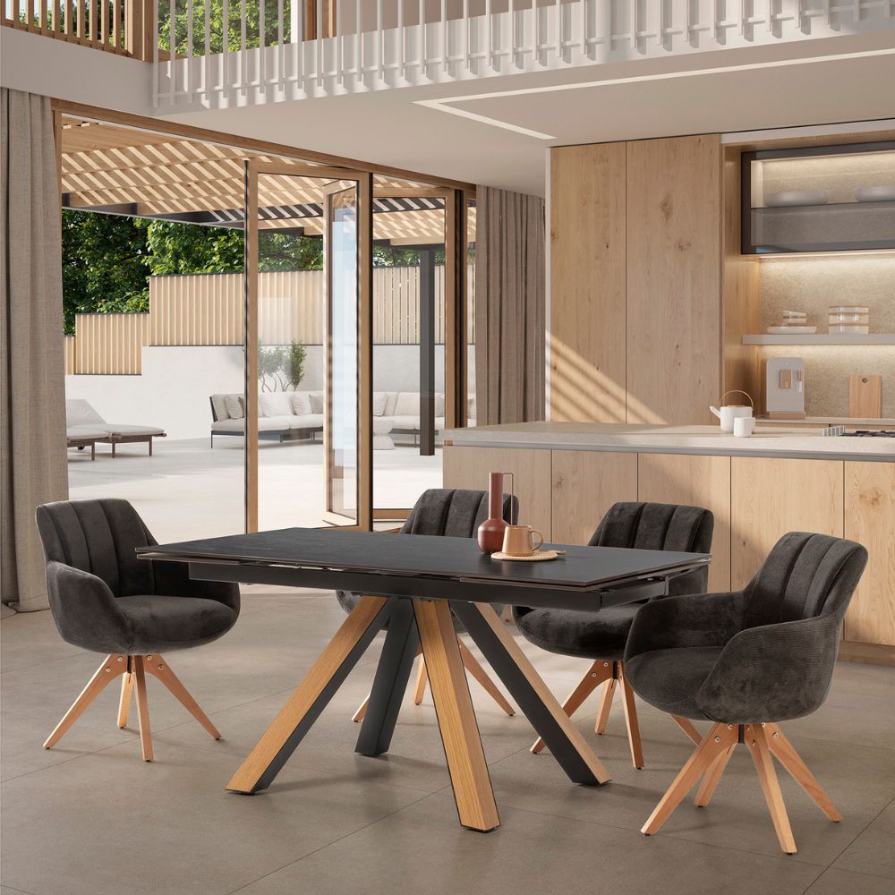Su característica principal es su base giratoria, que ofrece libertad de movimiento y mayor comodidad en el uso diario. Las patas de madera, con un diseño cálido y natural, crean un contraste perfecto con el tono oscuro del asiento, dando un acabado moderno y acogedor.