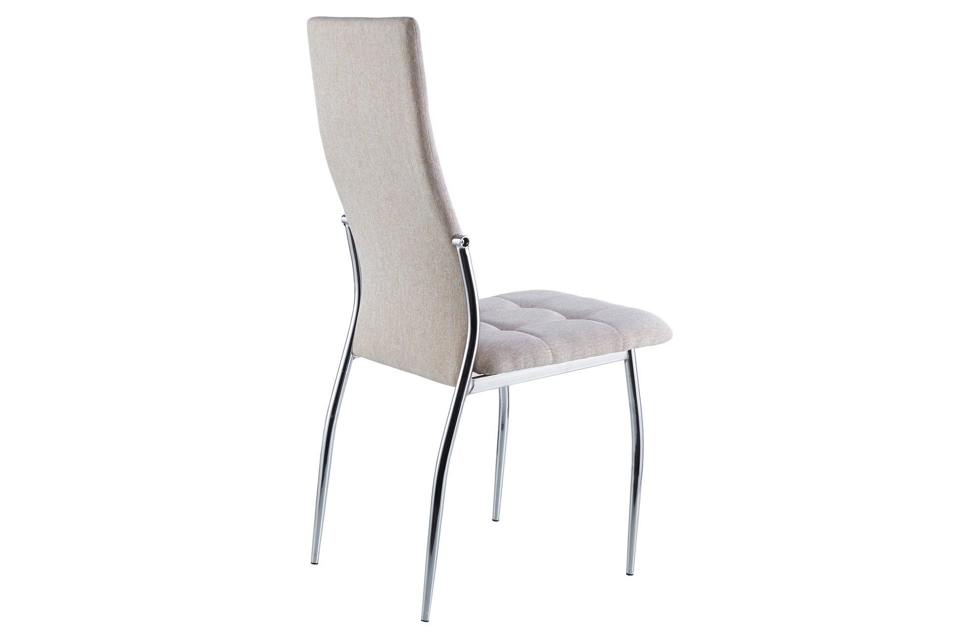 Silla comedor tapizada. Estructura metálica cromada. Tapizada en tejido gris y beige.