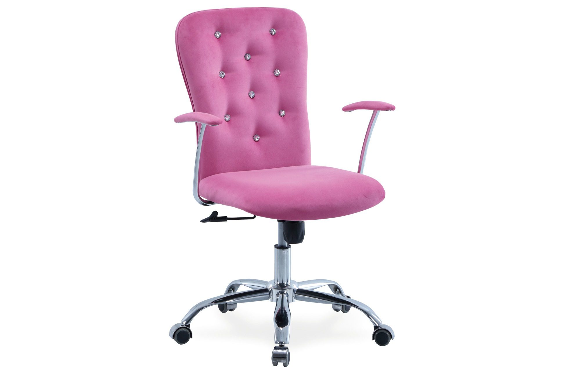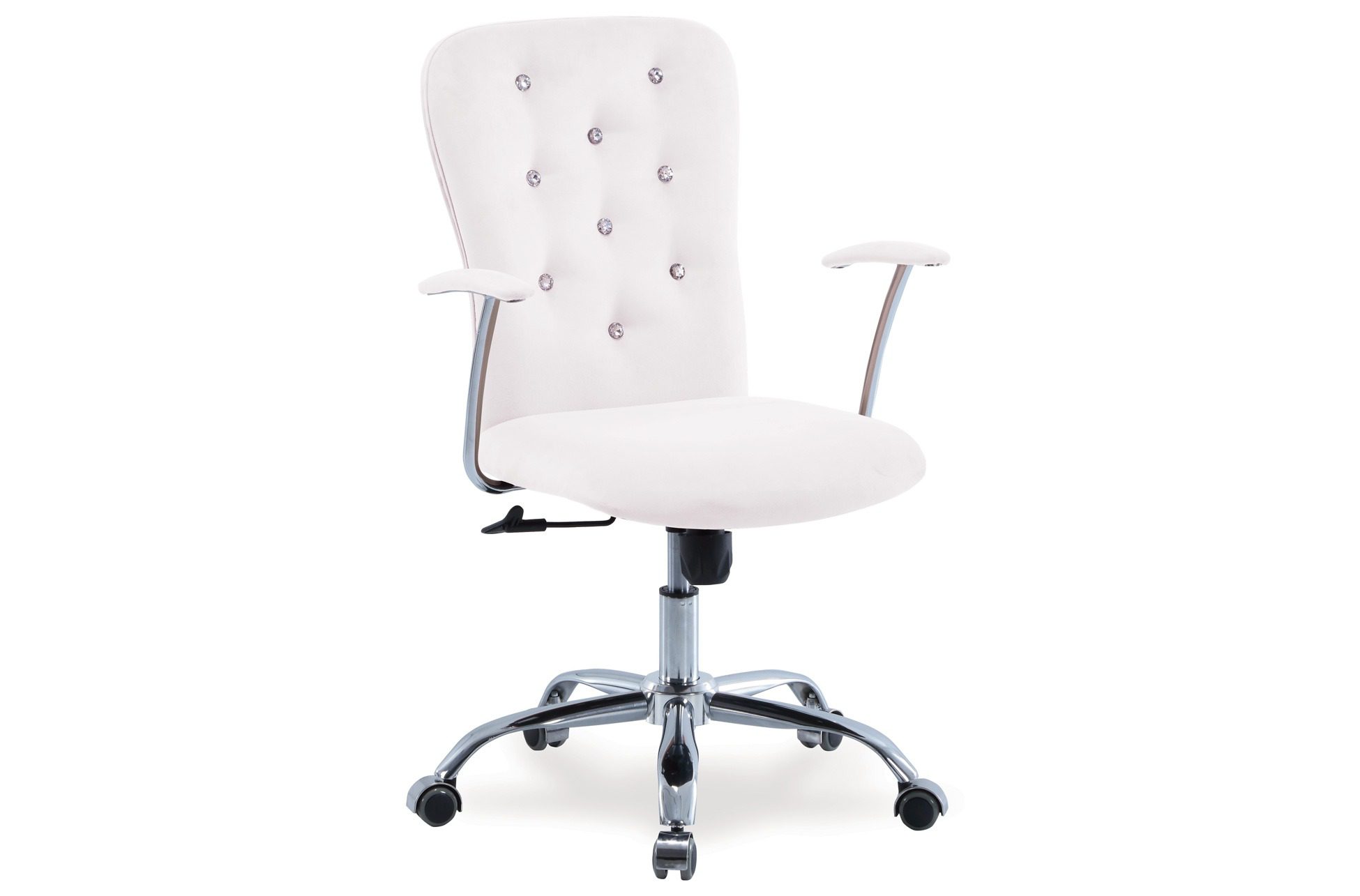 Giratoria con altura regulable. Mecanismo basculante con bloqueo. Brazos tapizados. Botones brillantes decorativos. Tejido símil piel. Kit inferior y brazos cromados